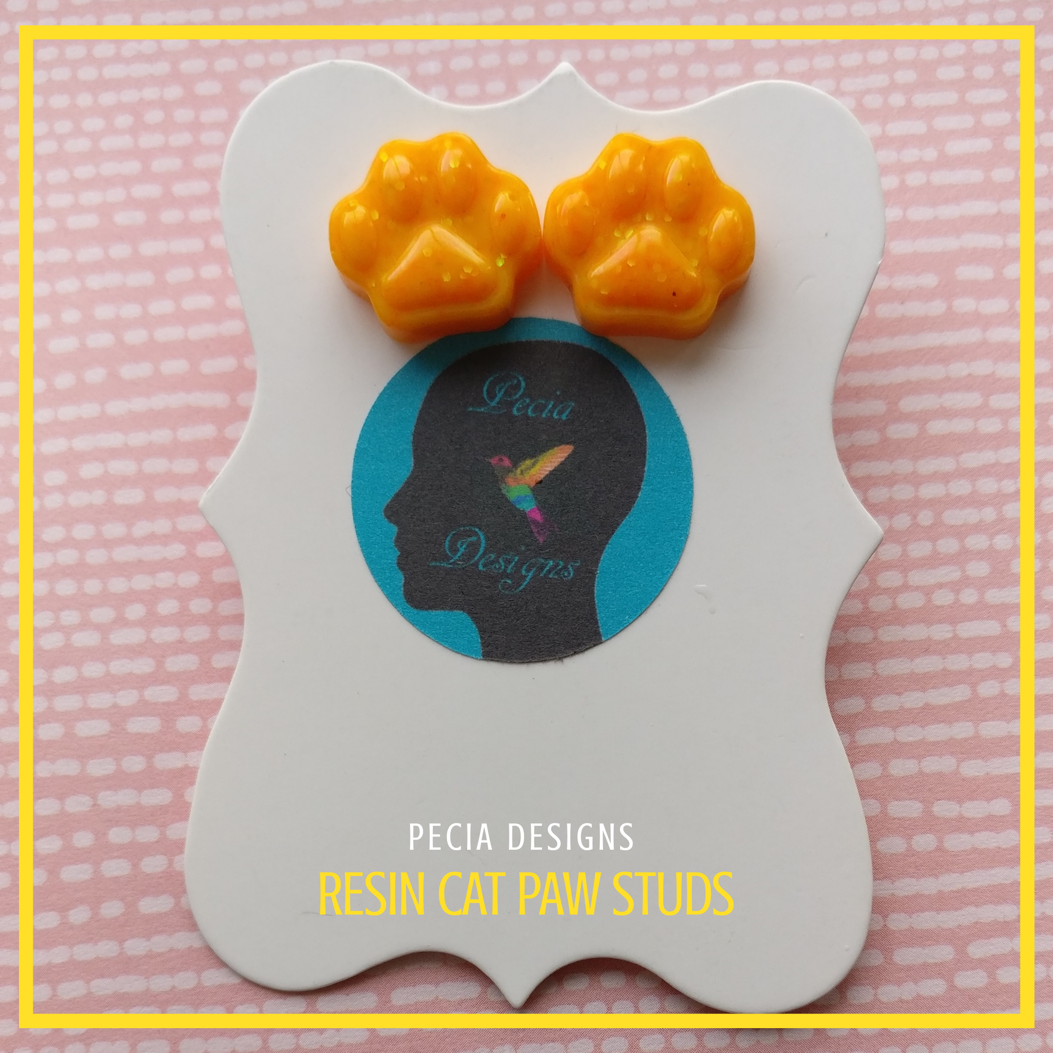 ‘Puss in Boots’ handmixed resin paw studs, with orange and yellow epoxy resin pigment and yellow glitter on a silver plate stud and butterfly backs COST: £4+ £2.45 P&P