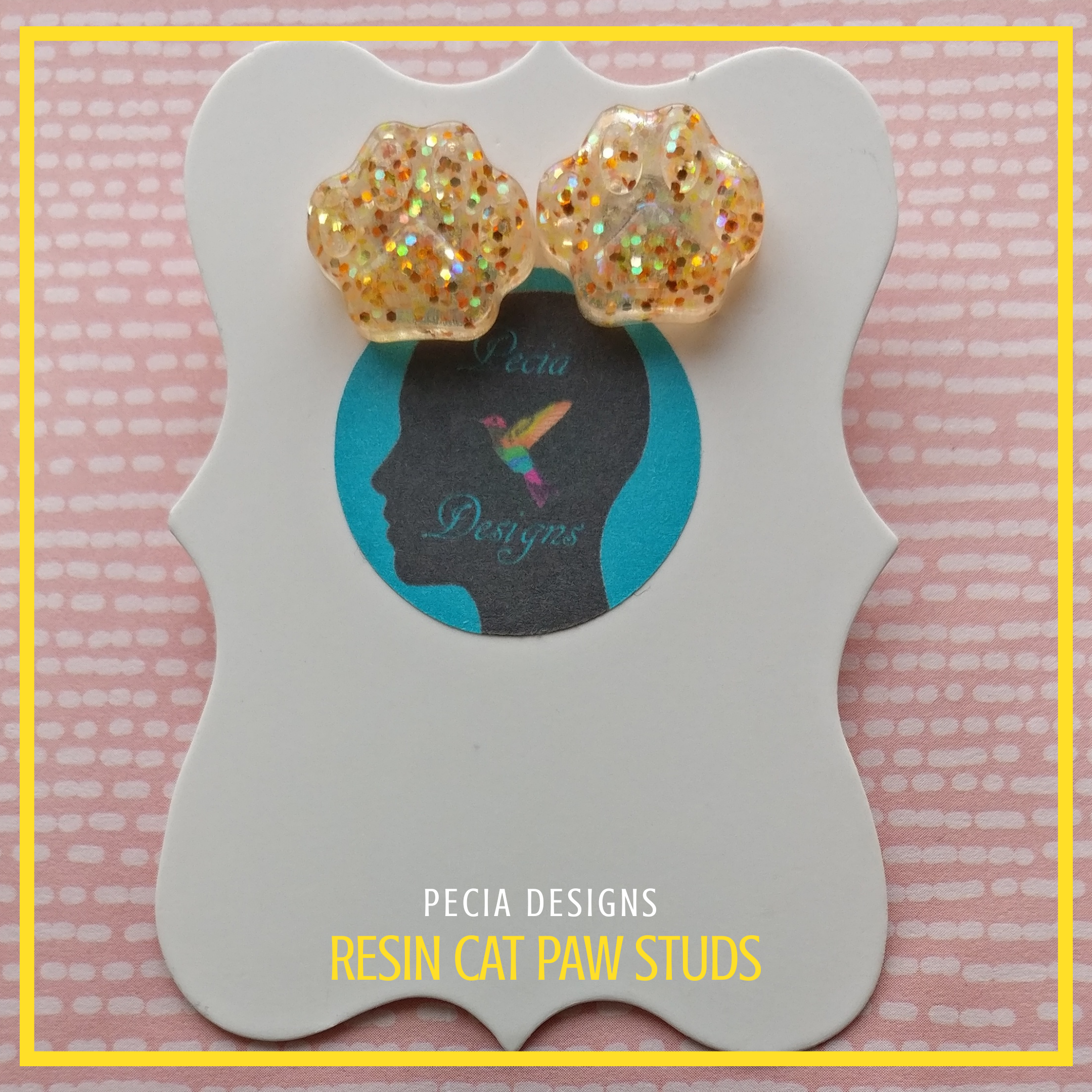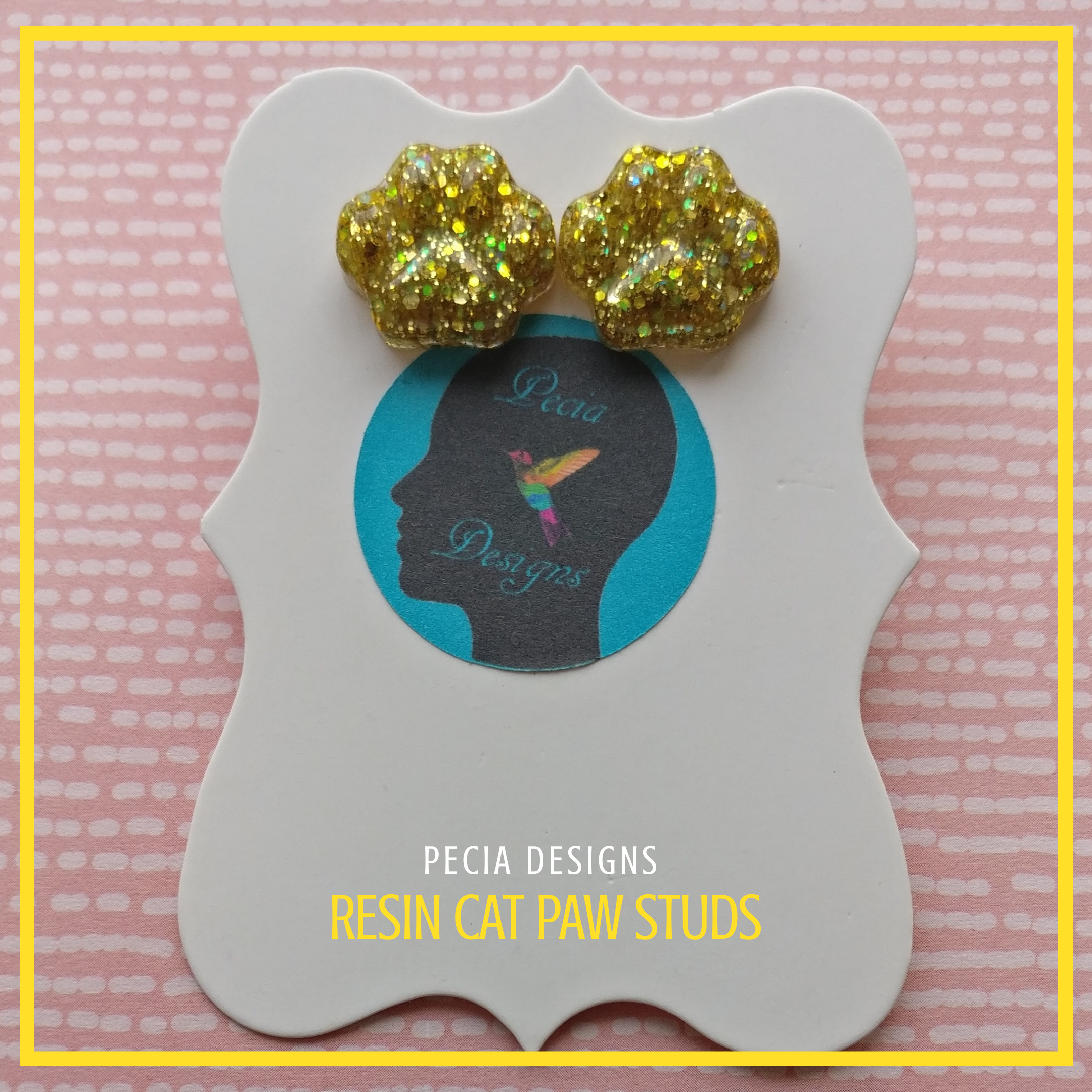 Goldy Locks handmixed resin paw studs, with clear epoxy resin, gold glitter on a silver plate stud and butterfly back. COST: £4+ £2.45 P&P