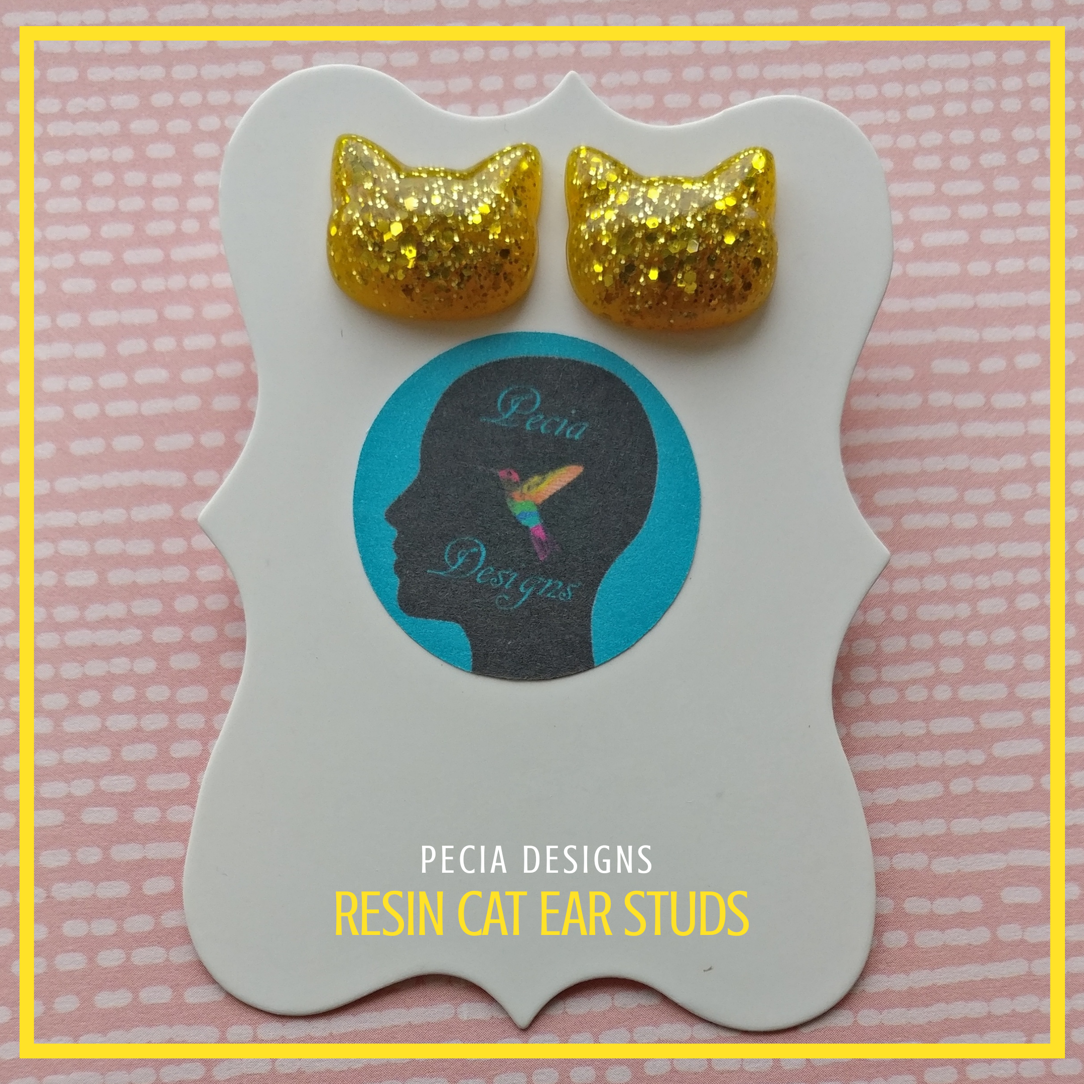 Goldy Locks handmixed resin cat ear studs, with clear epoxy resin, yellow resin pigment & gold glitter on a silver plate stud and butterfly back. COST: £4+ £2.45 P&P
