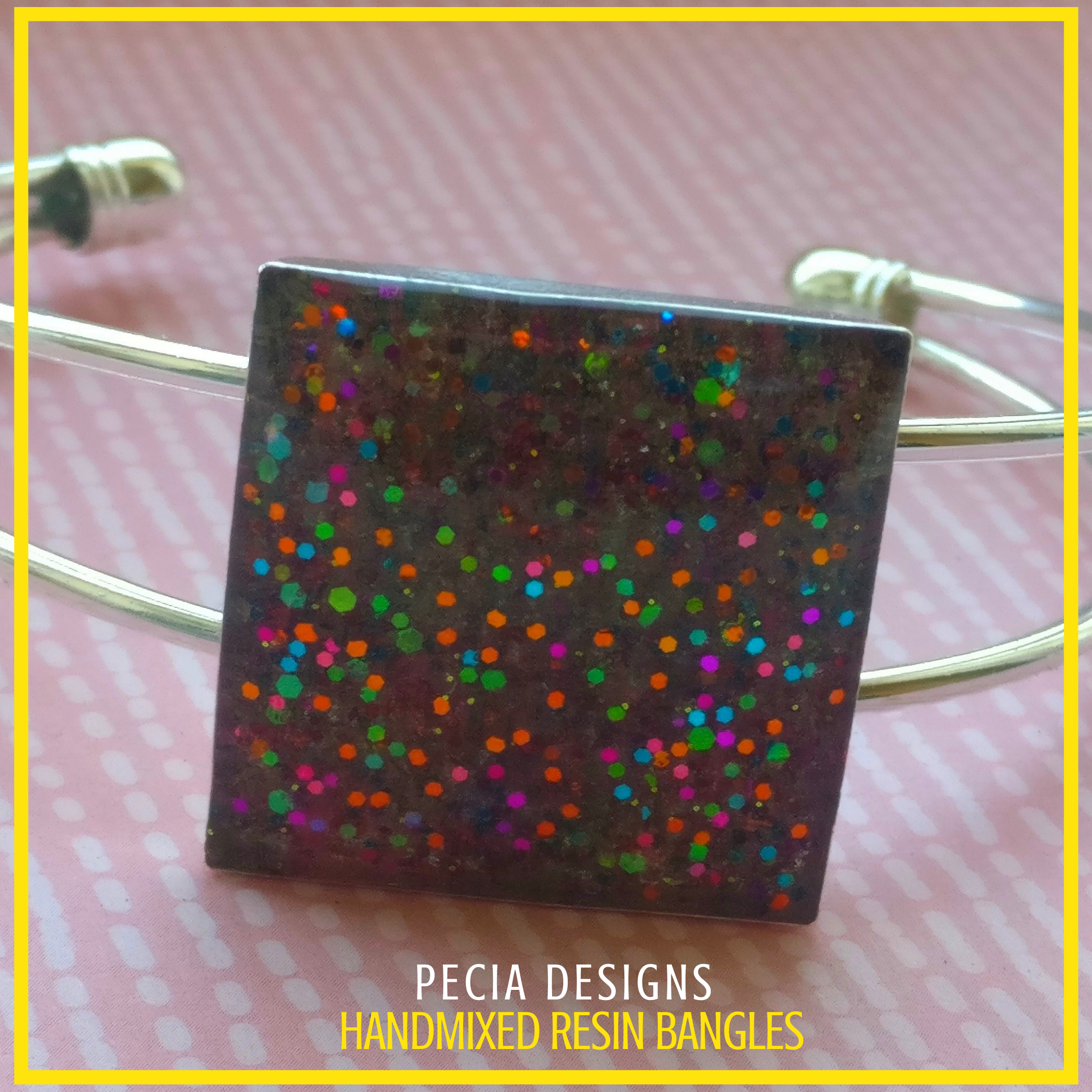 Hand mixed clear epoxy resin with a mix of different colour glitters, 12mm square bezel, silver plate magnetic bangle. COST: £10+ £2.45 P&P