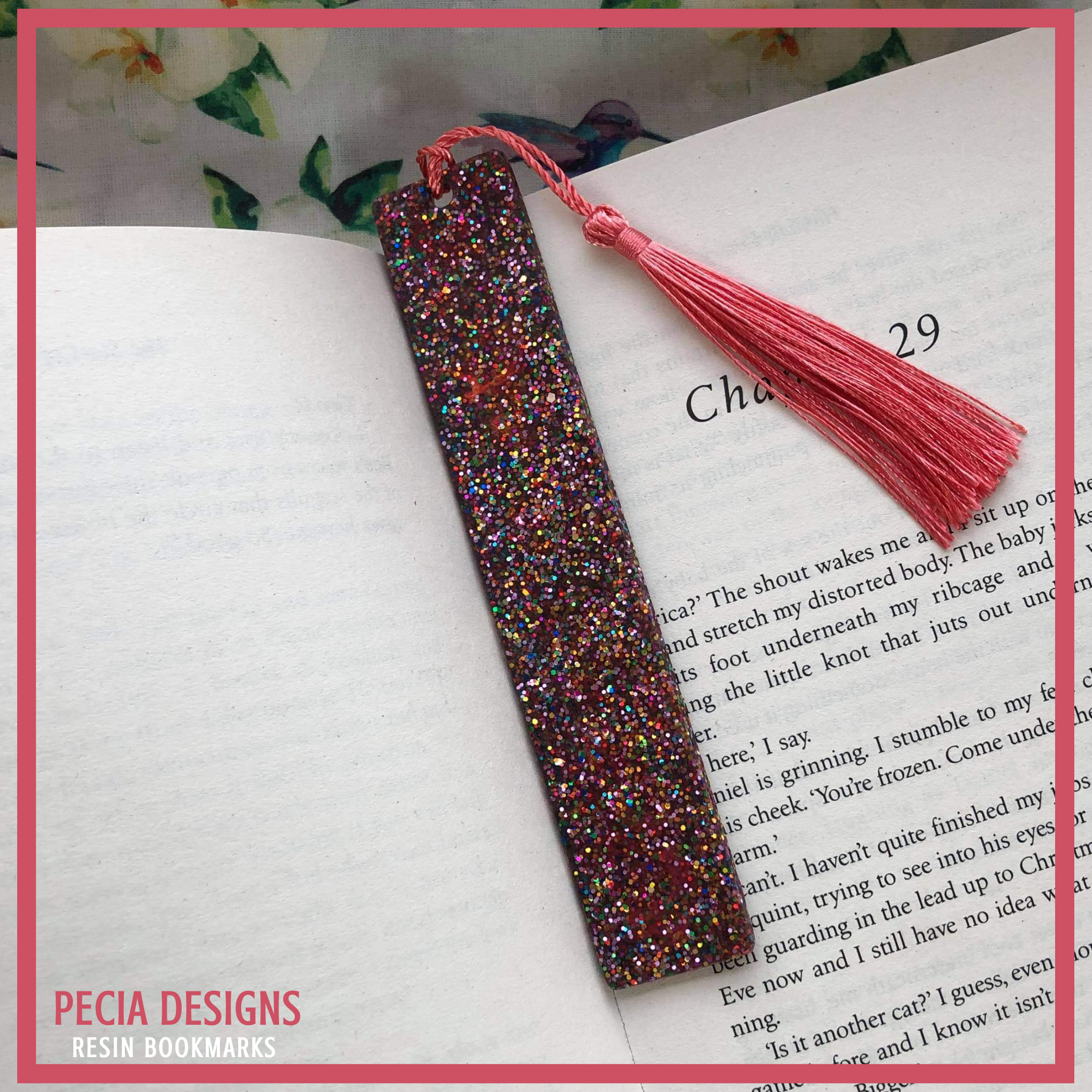 13.5cm bookmark, made with clear resin with a mix of gold, pink, red, blue and green glitter for a shimmer effect. COST: £6+ £2.45 P&P