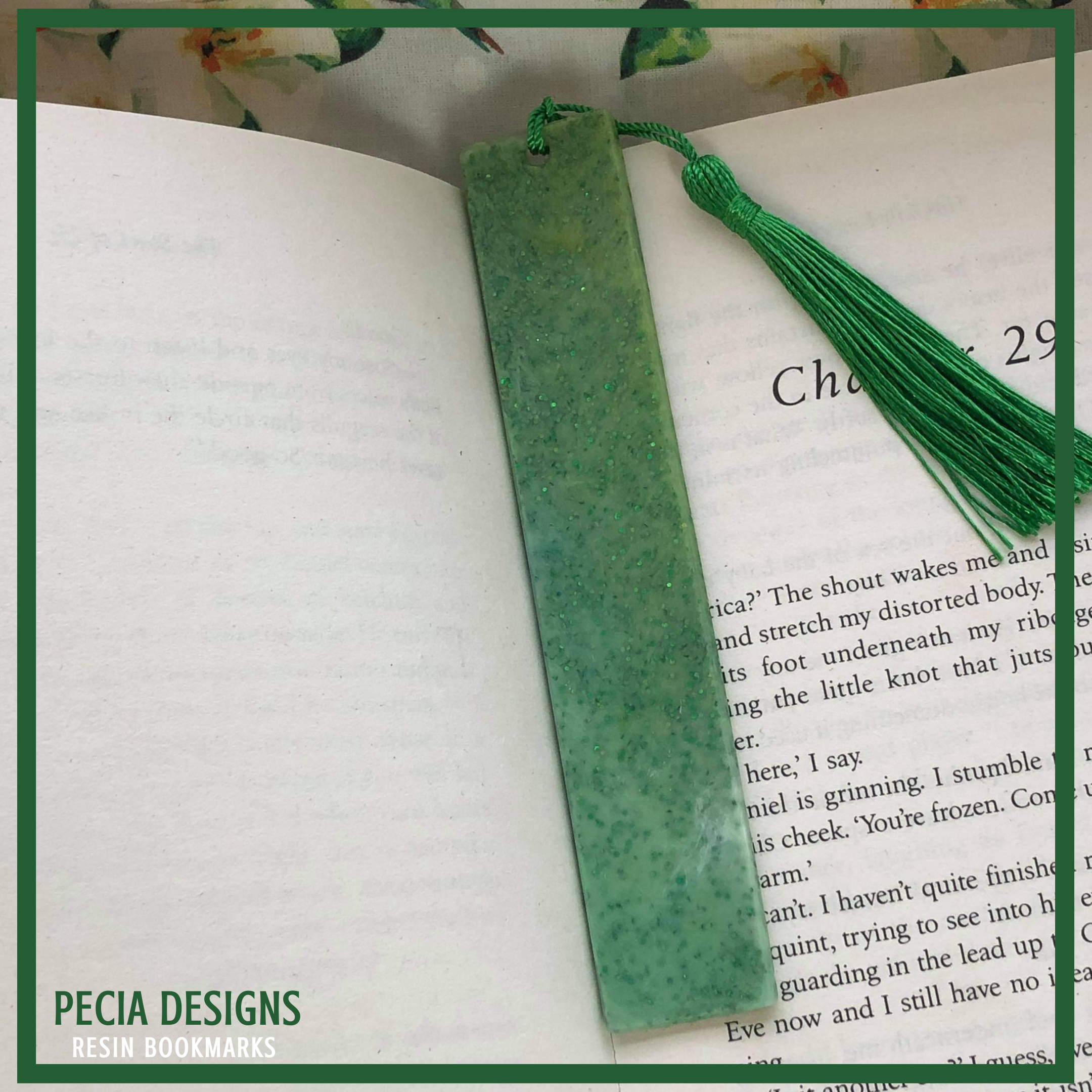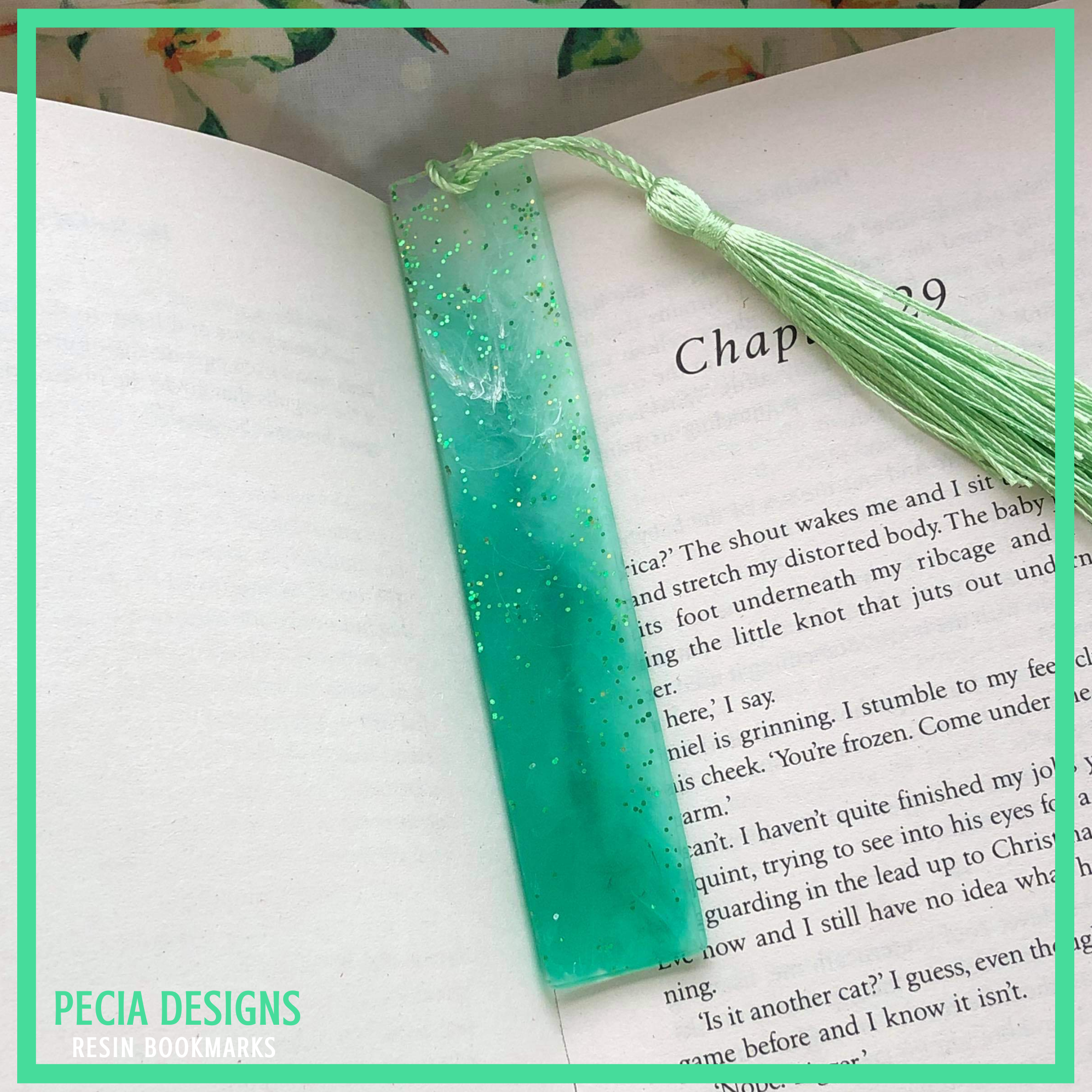 13.5cm bookmark, made with clear resin with a mix of emerald green, and white pigment for a marble effect. Mixed into the resin is also some dark green glitter for a shimmer effect. COST: £6+ £2.45 P&P