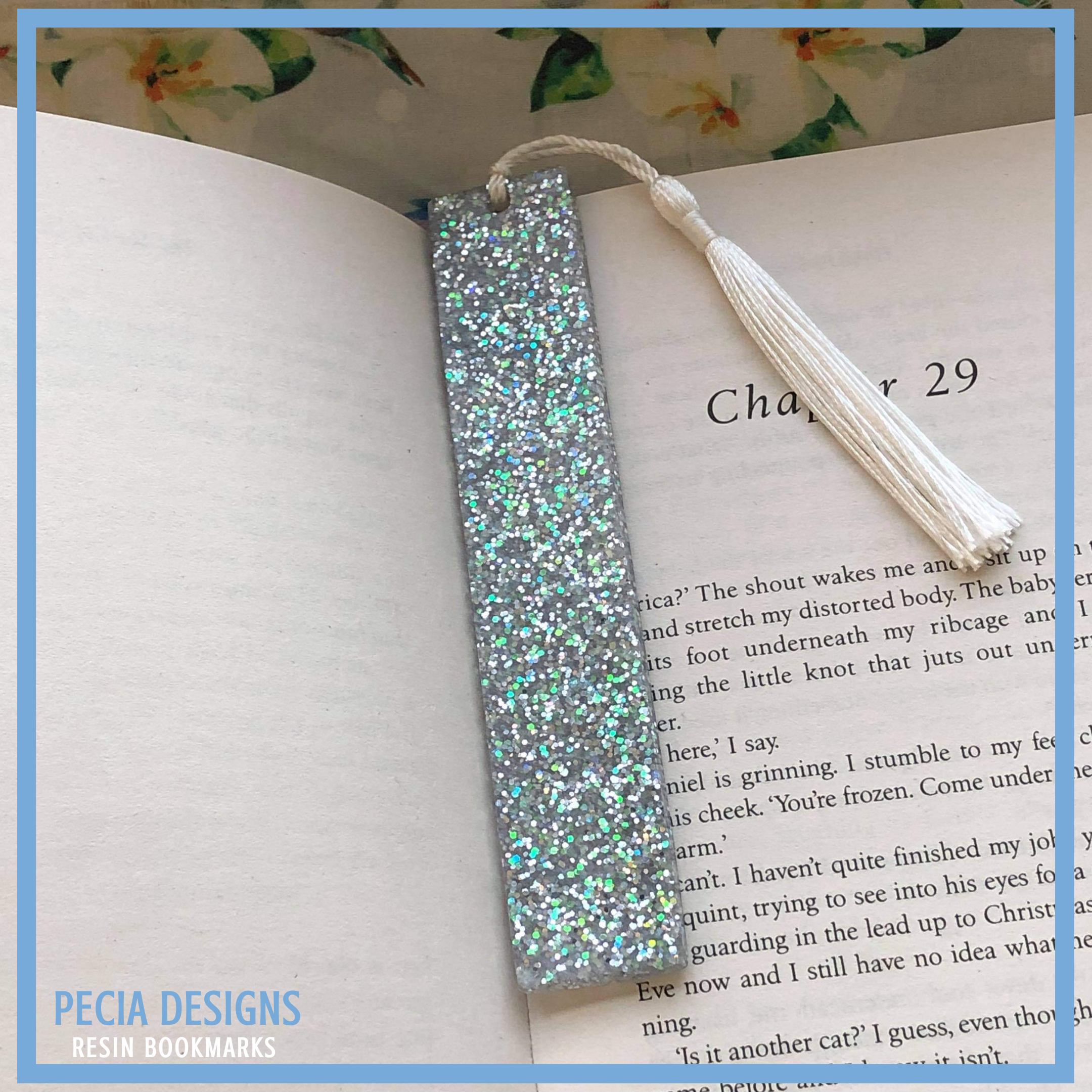 13.5cm bookmark, made with clear resin with a mix of irresdent, white and silver glitter, for a frosty effect. COST: £6+ £2.45 P&P