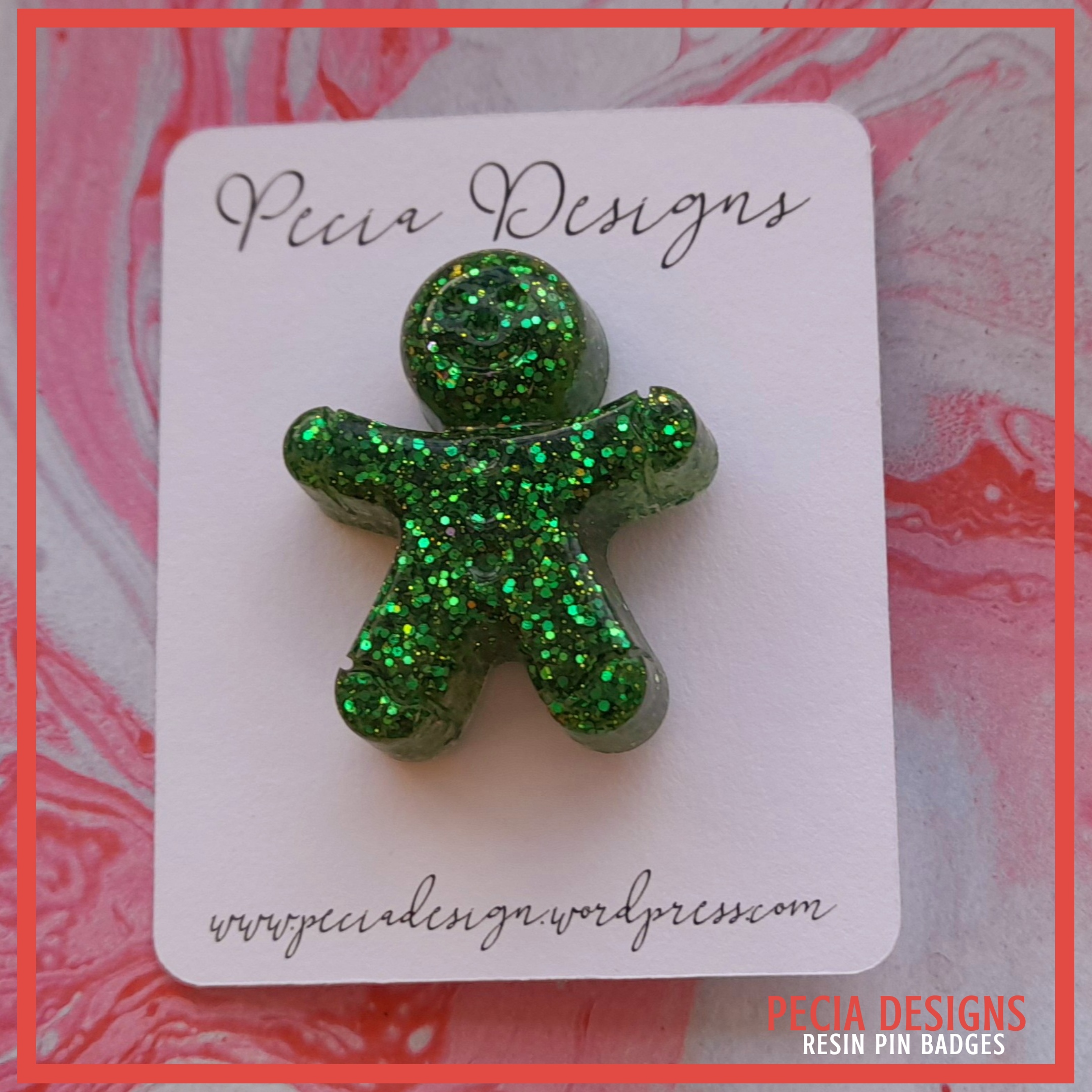 Green Gingerbread Man shaped pin badge made from a silicone mold, with silver plate backs and butterfly clasp. Clear resin used and a mix green glitter.