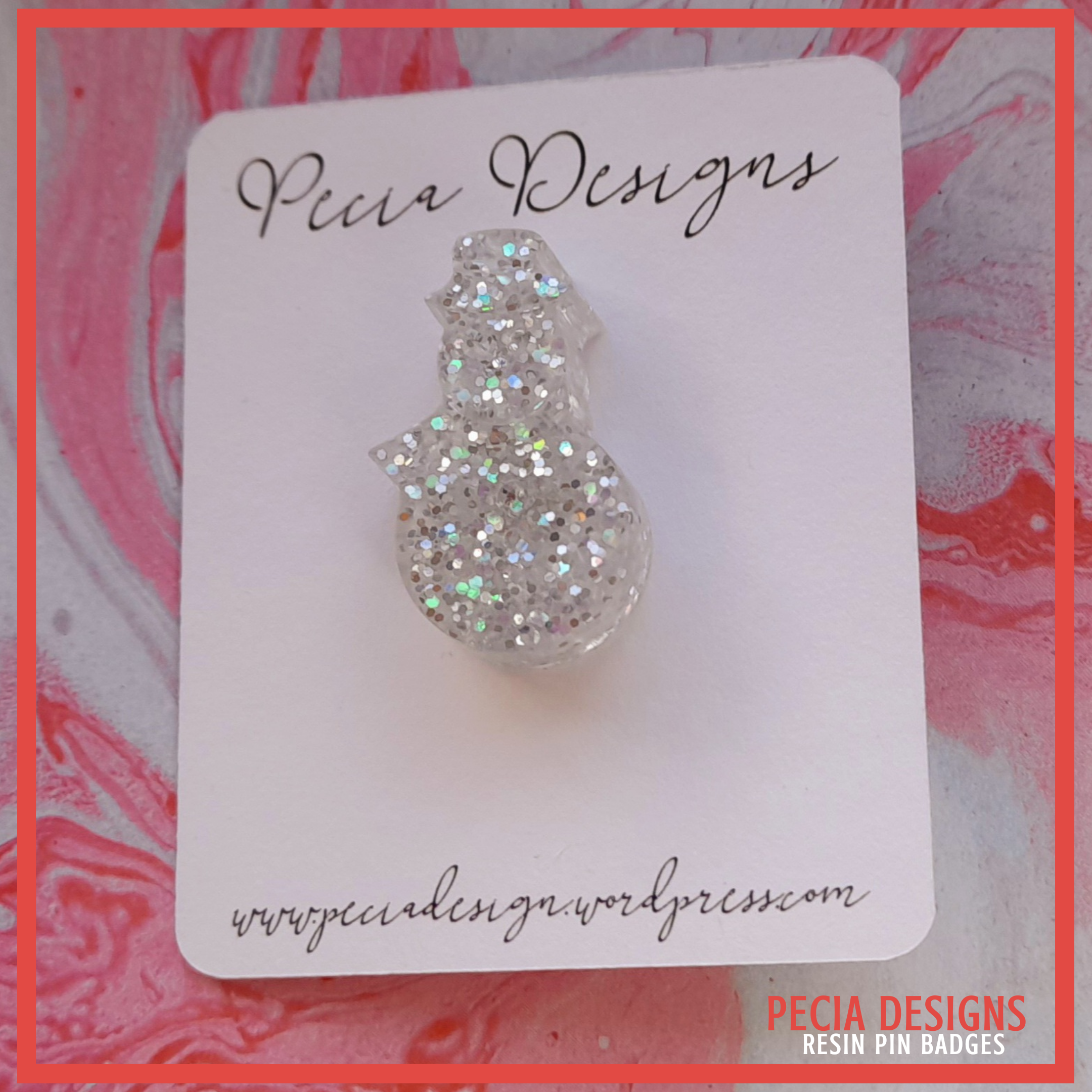 Silver snowman shaped pin badge made from a silicone mold, with silver plate backs and butterfly clasp. Clear resin used and a mix iridescent and silver glitter. x2 available!