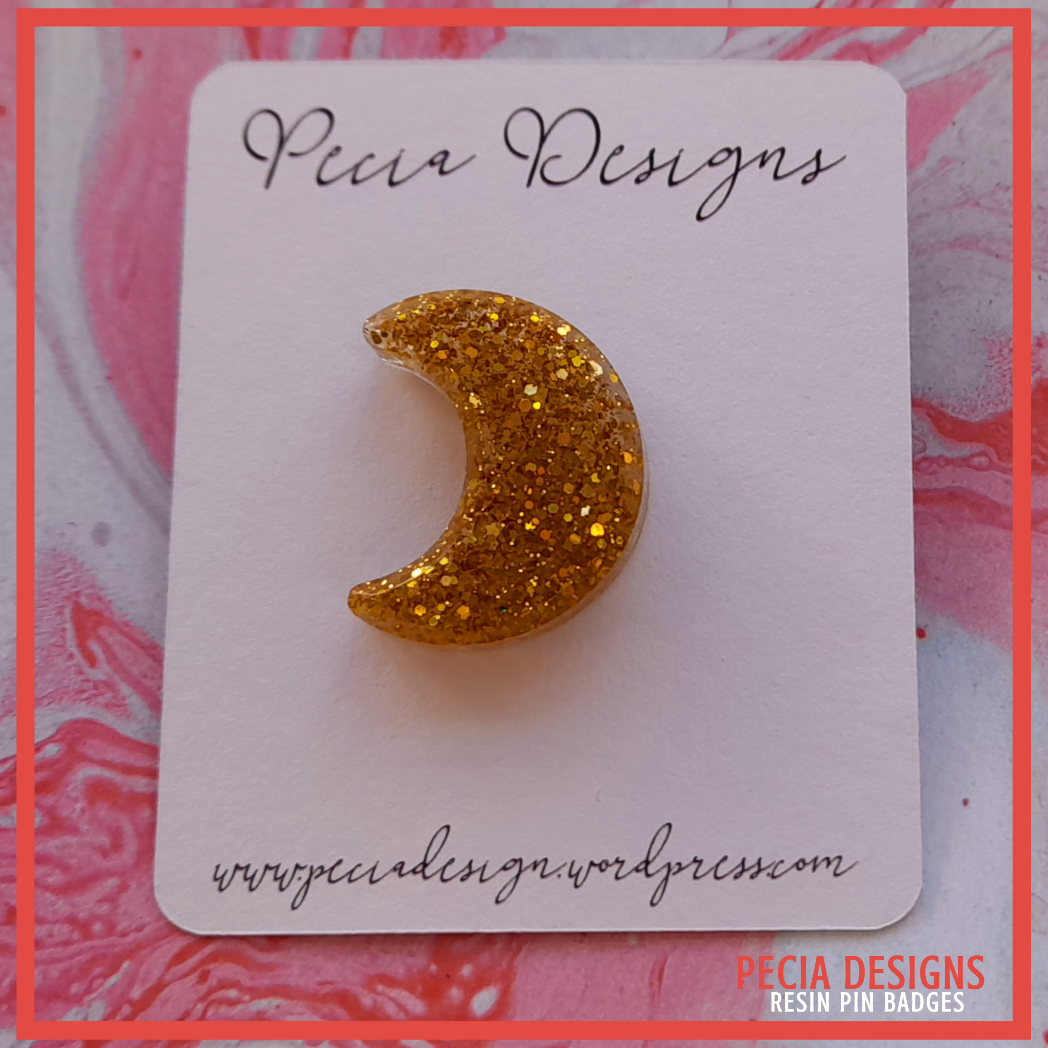 Gold moon shaped pin badge made from a silicone mold, with silver plate backs and butterfly clasp. Clear resin used and a mix gold and yellow glitter.