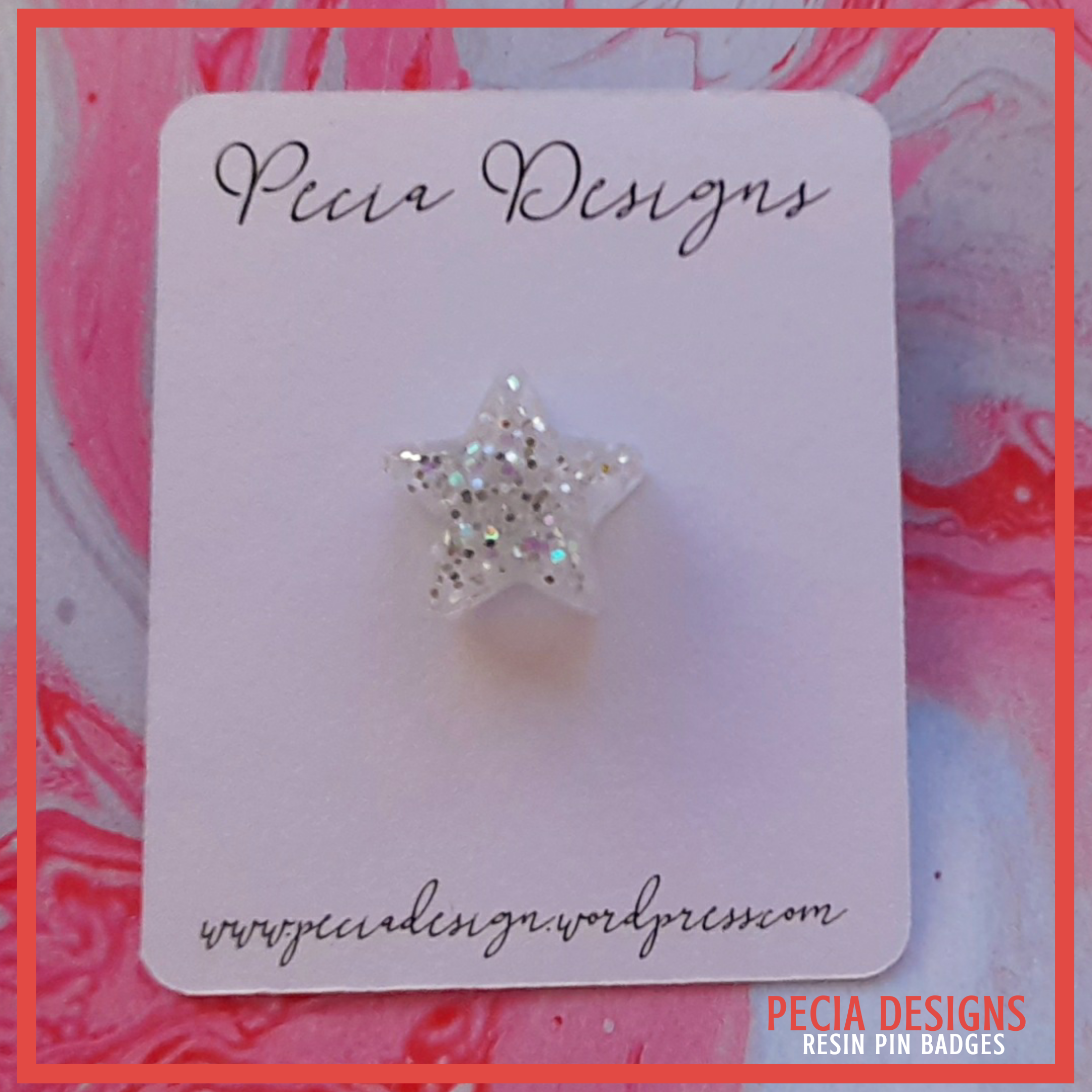 Silver star shaped pin badge made from a silicone mold, with silver plate backs and butterfly clasp. Clear resin used and a mix iridescent and silver glitter.