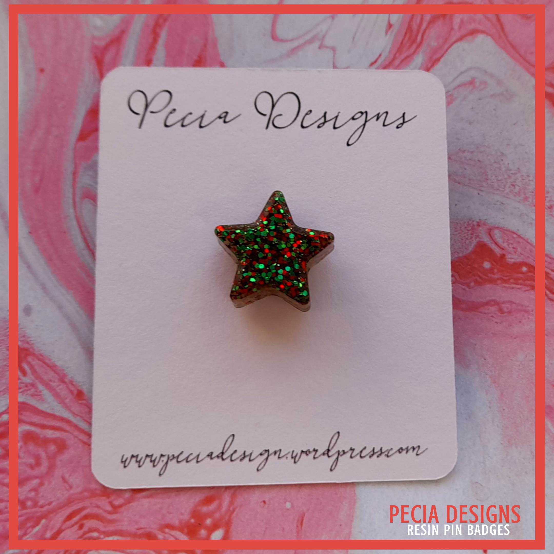 Green star shaped pin badge made from a silicone mold, with silver plate backs and butterfly clasp. Clear resin used and a mix green and red glitter.