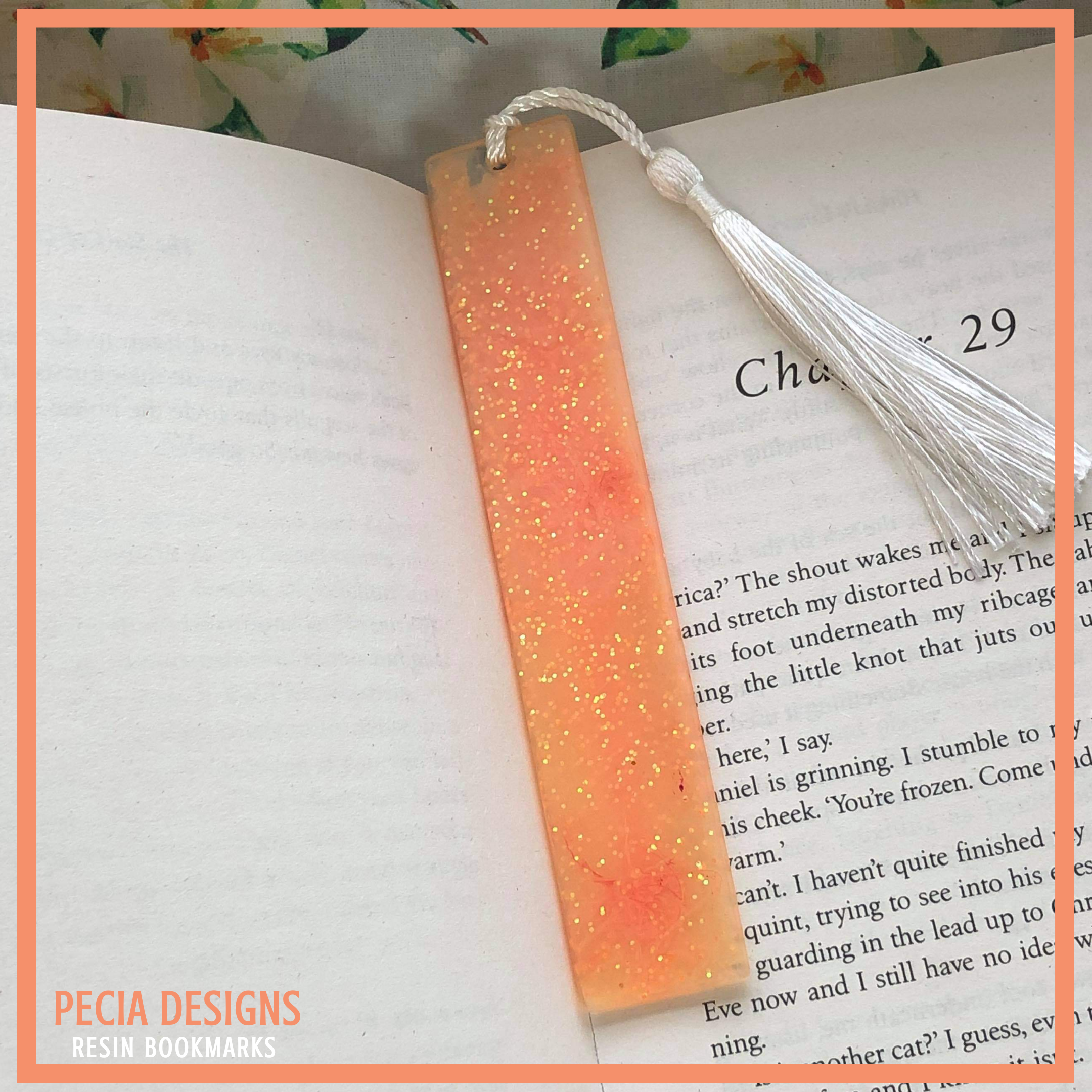 13.5cm bookmark, made with clear resin with a mix of orange, yellow and white pigment for a marble effect. Mixed into the resin is also some irridesent glitter for a shimmer effect. COST: £6+ £2.45 P&P
