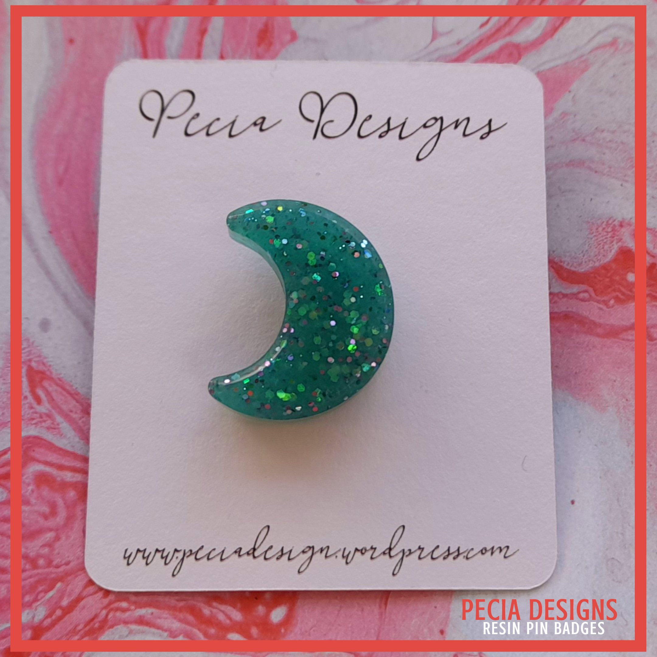 Turquoise moon shaped pin badge made from a silicone mold, with silver plate backs and butterfly clasp. Clear resin used and a mix iridescent glitter and aquamarine pigment.